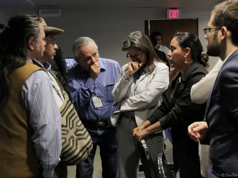 Indigenous leaders deliberate during the May 15, 2015, negotiations on the draft American Declaration on the Rights of Indigenous Peoples. Photo courtesy Vera Narvaez-Lanuza.