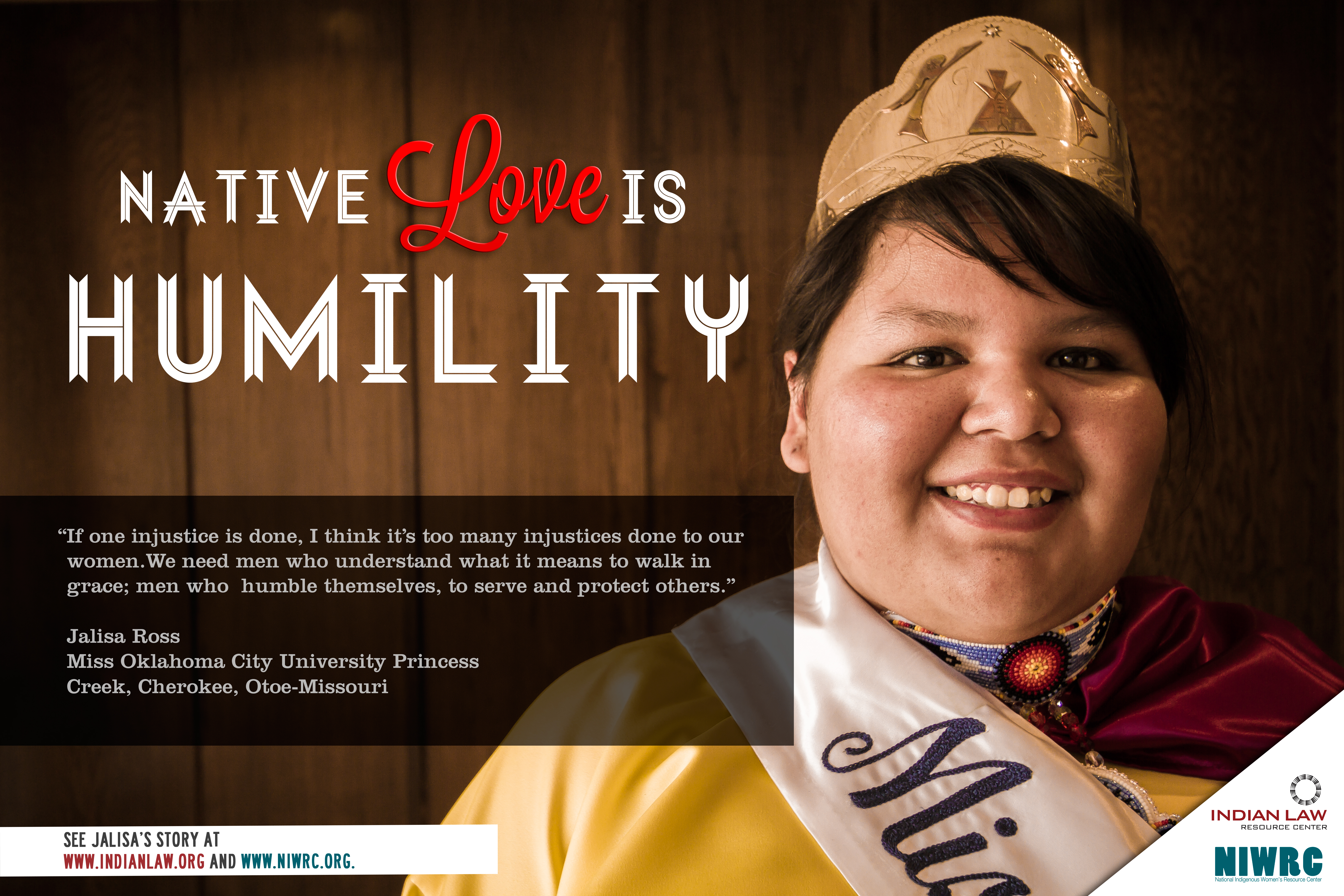 JALISA ROSS (Creek, Cherokee, and Otoe-Missouri) is a senior majoring in political science at Oklahoma City University, where she is the reigning Miss Indian OCU. Jalisa was interviewed as a part of a joint project of the Indian Law Resource Center and the National Indigenous Women’s Resource Center to define Native love. The project focuses on raising awareness about violence against Native women and empowering Native people to speak out about traditional cultural values that honor and respect Native women.