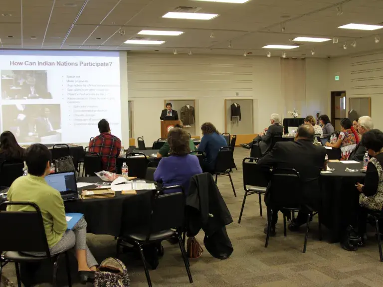 April 22, 2016| Shawnee, Okla. — Indian nations have historically been international actors and a part of the world community of sovereign nations, and this is shown by their treaties with the United States and other nations. Today, tribes are seeking to rejoin the international community in order to protect their lands, sovereignty, and cultures, and to benefit their communities, according to experts who spoke at the “Indian Nations in the United Nations” workshop hosted by the Citizen Potawatomi Nation and the Indian Law Resource Center on April 22, 2016 at the Citizen Potawatomi Nation Cultural Heritage Center in Shawnee, Okla.