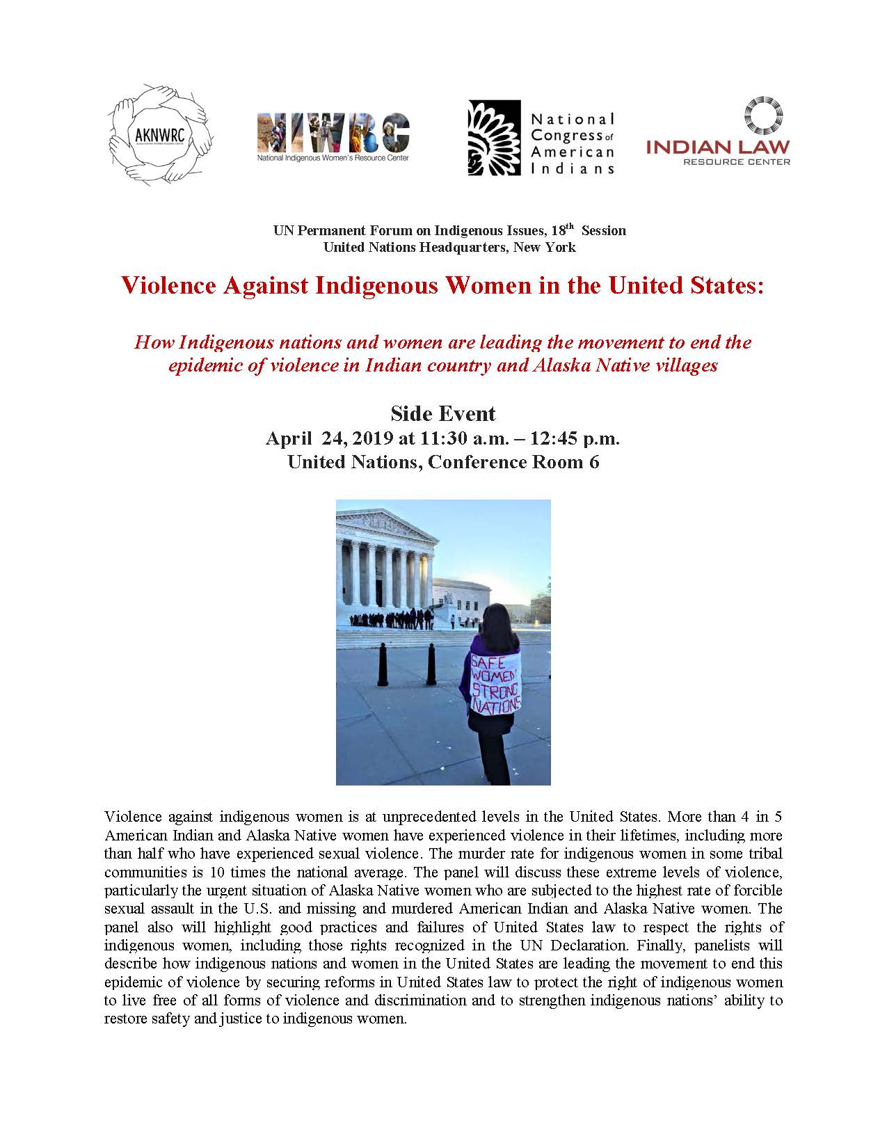 March 24, 2019 | New York, NY ̶ Speakers from American Indian tribes and Alaska Native villages and indigenous organizations are converging for an important panel discussion on violence against indigenous women. The side event, Violence Against Indigenous Women in the United States: How Indigenous nations and women are leading the movement to end the epidemic of violence in Indian country and Alaska Native villages, will take place at the United Nations Permanent Forum on Indigenous Issues, 18th Session, on April 24, 2019, from 11:30 a.m. – 12:45 p.m. EST in Conference Room 6.